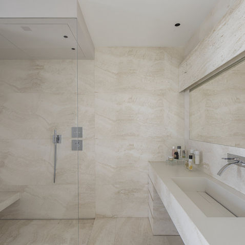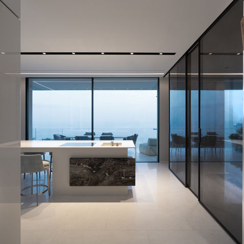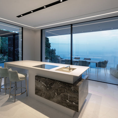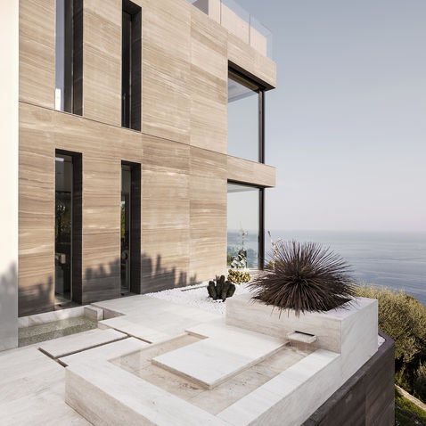 Progetto di una prestigiosa villa in Costa Azzurra: Villa padronale, 3 dependance, piscina e pool house inseriti in un parco di 4500mq. La villa padronale si incastona in una parete di roccia che ne determina la forma. L'accesso è ubicato al livello più alto dove si trova la dell'ampio garage. Un'ascensore panoramico collega quindi il livello più alto con il livello della zona giorno ed un passaggio nella roccia conduce dallo sbarco dell'ascensore al grande soggiorno passando per la sala biliardo caratterizzata da una splendida cantina vini. La zona living gode di un'ottima vista sul mare grazie ad ampie vetrate ed è suddivisa in due ambienti contigui: la zona soggiorno e la zona cucina caratterizzata da una grande isola in marmo e una zona più tecnica utile alla preparazione professionale dei cibi. Un'insenatura nella roccia viene sfruttata per realizzare un piccolo giardino zen. Dal piano giorno si raggiunge la zona notte utilizzando l'importante scala in marmo arabescato orobico o per mezzo di un secondo ascensore. La zona notte contiene una suite padonale con grande vetrata vista mare, due bagni, due dressing ed uno studio privato. Il piano -1 è caratterizzato da due camere con bagno a servizio degli ospiti, una sala cinema, una SPA completa di minipiscina, hammam e doccia emozionale, una palestra edd una locale pilates, oltre che una pool house dotata di cucina e zona relax con TV che da direttamente sulla piscina a sfioro completata da una vasca idromassaggio. Il terrazzo attrezzato, raggiungibile tramite ascensore interno, offre una vista unica sul golfo. Da qui si accede tramite una scala incastonata nella roccia alla quota più alta del rilievo dove è stato organizzato un orto-giardino.